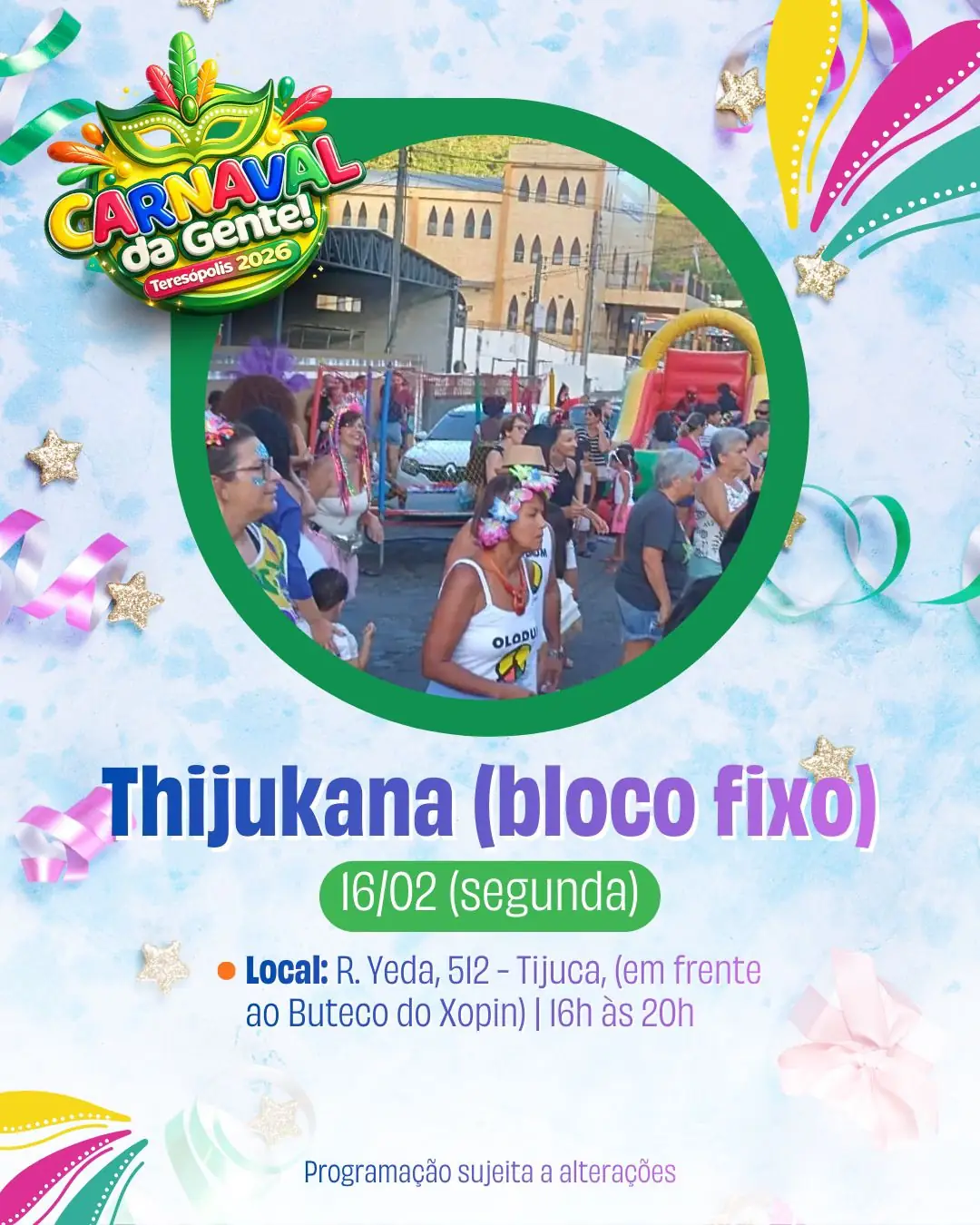 O 'Carnaval da Gente 2026' é uma realização da Prefeitura de Teresópolis, através da Secretaria de Turismo, com colaboração de outras secretarias municipais e apoio do Governo do Estado do Rio de Janeiro, Mox Produções, FUNARJ, Teresópolis Shopping e Grupo El Akbar, além do patrocínio da Loterj.