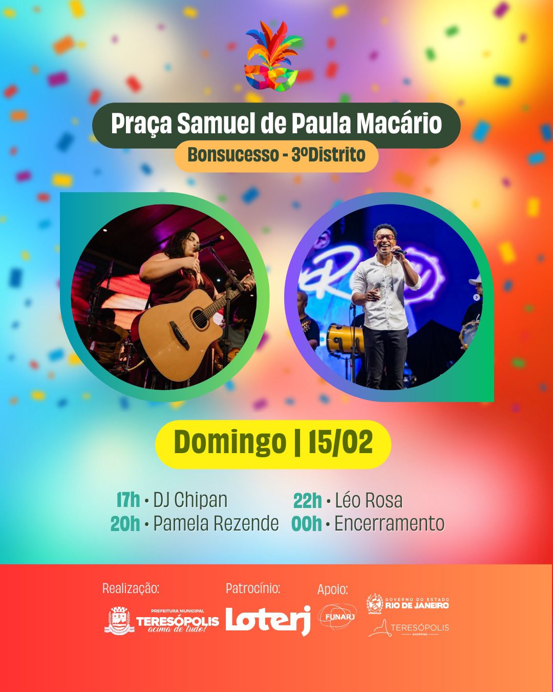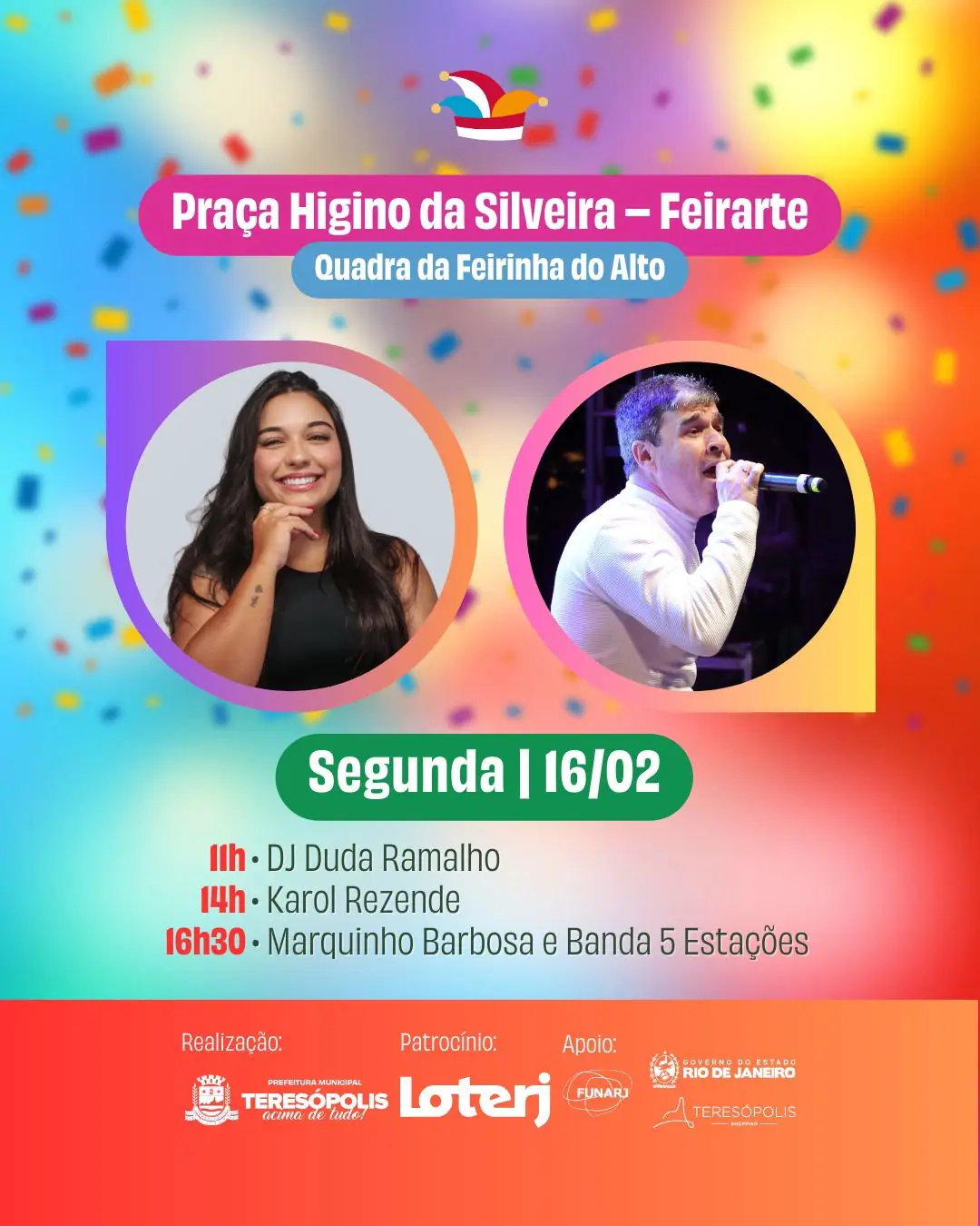 Ao longo de cinco dias, a agenda cultural se espalhará por pontos estratégicos do município. As celebrações terão como palco a Feirinha do Alto (Praça Higino da Silveira), a Praça Olímpica Luís de Camões, na Várzea, a Praça Nilo Peçanha, no Alto, e ainda em Bonsucesso, no 3º Distrito. A programação contará com shows de artistas locais e o colorido dos desfiles de blocos, reafirmando o caráter democrático e vibrante da festa teresopolitana.