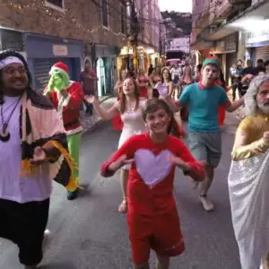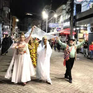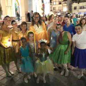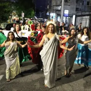 Ao ritmo de canções temáticas e embalados por sorrisos e coreografias, o grupo de participantes incluiu professores e alunos das oficinas da Casa de Cultura Adolpho Bloch, membros da Companhia de Cena Musical Serra Encena, do SD Allegro Studio de Dança, de Ynara Zahirah Danças Árabes e outros artistas convidados. O percurso teve início na Praça Olímpica Luís de Camões, seguiu pela Rua Monte Líbano e Avenida Delfim Moreira, culminando no Parque Regadas. O cortejo contou com o apoio da Guarda Civil Municipal para a organização do fluxo de veículos.