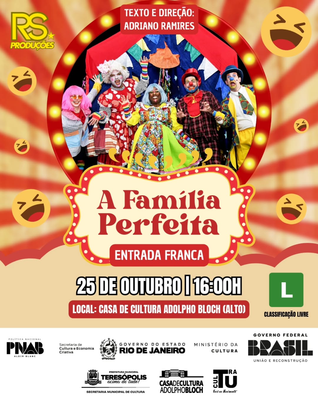 - A Família Perfeita: Para garantir boas risadas e entretenimento, a peça 'A Família Perfeita' será apresentada no teatro da Casa de Cultura Adolpho Bloch (Praça Juscelino Kubitschek, bairro de Fátima) neste sábado, 25, a partir das 16h. Com texto e direção de Adriano Ramires e produção de Rodrigo Santos, a peça é para todas as idades. A programação inclui a Oficina de Circo com o Palhaço Fiapo, personagem do artista circense Ivo Bernardo. Realização da RS Produções; apoio da Secretaria de Cultura.