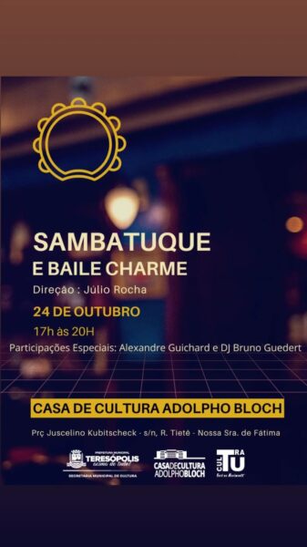 - 'Sambatuque e Baile Charme': Nesta sexta-feira, 24, o samba e o charme se unem no evento 'Sambatuque e Baile Charme', que promete animar a Casa de Cultura Adolpho Bloch (Praça Juscelino Kubitschek, bairro de Fátima), das 17h às 20h. Sob a direção do professor, coreógrafo e percussionista, Júlio Rocha, o evento contará com a participação especial do violonista Alexandre Guichard e do DJ Bruno Guedert. Basta comparecer e, literalmente, entrar no ritmo. Realização da Secretaria de Cultura.
