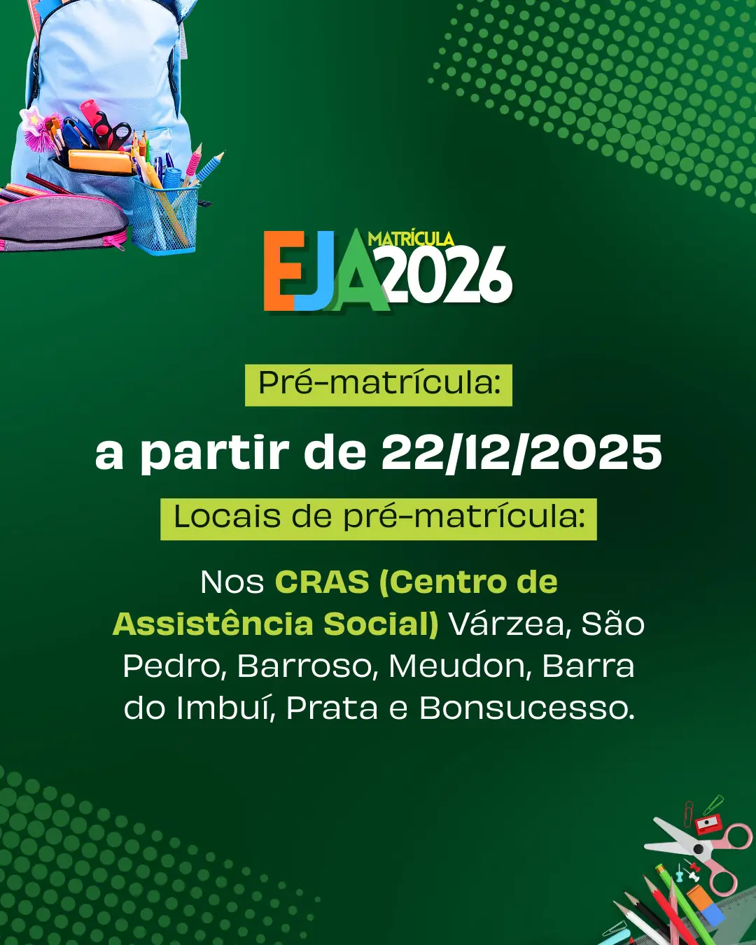 Pré-matrículas para a EJA 2026 têm início no dia 22 nos CRAS