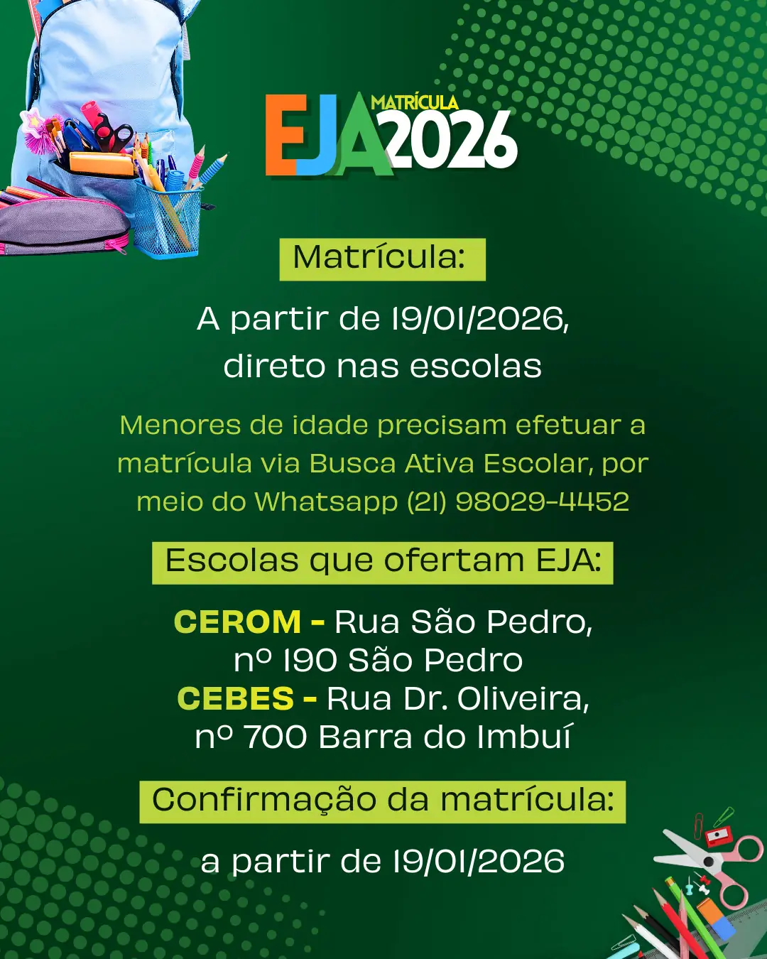 A efetivação das matrículas poderá ser realizada a partir de 19 de janeiro de 2026, diretamente nas unidades escolares que sediam a EJA, ou seja, no CEROM e no CEBES.